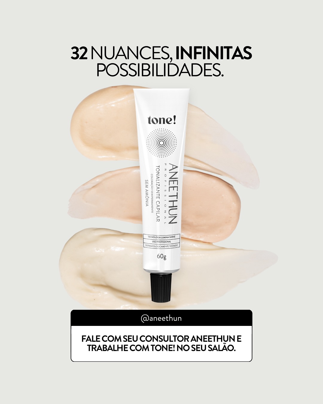 É nesse ponto que o TONE da Aneethun se destaca. Com sua cartela completa de nuances, fórmula vegana e a tecnologia Lumina Shine, ele oferece ao profissional a segurança necessária para entregar resultados uniformes, brilhantes e duradouros em qualquer correção de cor.